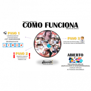 "Somos una organización de APOYO TERAPÉUTICO", con un *grupo de apoyo gratuito* como valor agregado para pacientes y personas con necesidades de salud mental.