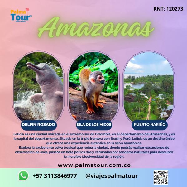 Pack desde $1'390.000. *4 días 3 noches. *Vuelos Ida y Regreso ✈️🎒 *Hotel alimentos según elección 🏨 *Tour Puerto Nariño 🚤🐬 si aplica *Seguro de viaje 🧑⚕️ *Traslados 🚗 🚤 * Acomodación Doble, triple, Cuádruple *No incluye tarjeta de Turismo *Precio por Persona Salidas de: Cali, Pereira, Armenia, Medellín, Bogotá. El precio puede variar según la fecha de viaje, o cantidad de personas, la ciudad de salida o el tipo de alimentación.