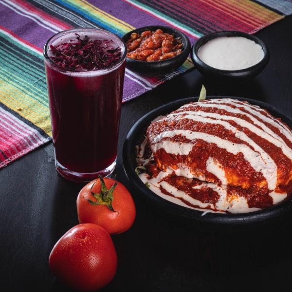Sandwich en pan artesanal con Frijoles refritos, Costra de queso, Carnitas. Lechuga, tomate y guacamole cubierto con una salsa de chile guajillo (no picante) y crema agria.