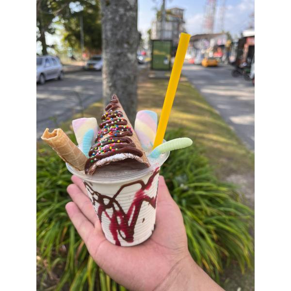 Malteada elaborada con tu sabor de helado preferido con con barquillo, cono, masmelos, gomas y galletas con una deliciosa salsa de chocolate, una perfecta combinación de sabores para un deleite indescriptible, ideal para disfrutar en días soleados, después del deporte, durante una caminata, una tarde de descanso. Ven y compártela con tu compañía favorita