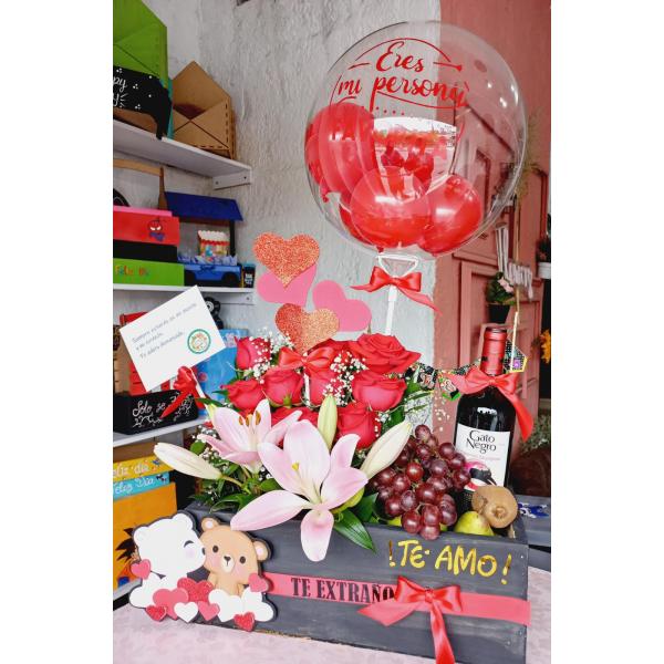 Acompañado de vino frutas y decoración personalizada. Incluye domicilio, tarjeta, frutas, flores, vino.