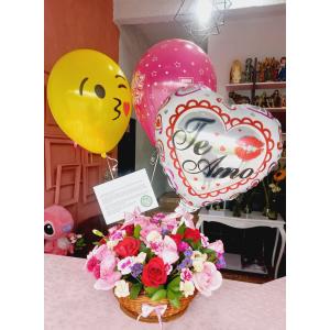 Realizada con flores surtidas, incluye tarjeta domicilio 3 globos