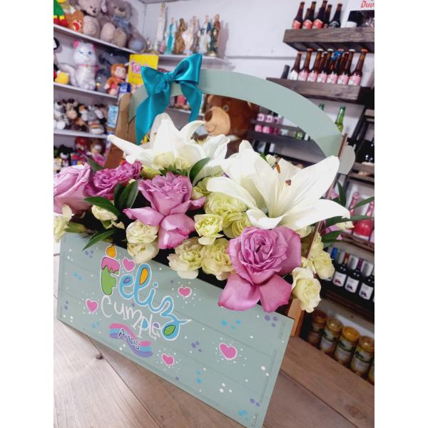 Elaborada en caja de madera decorada a mano y personalizada. Acompañada de domicilio y tarjeta