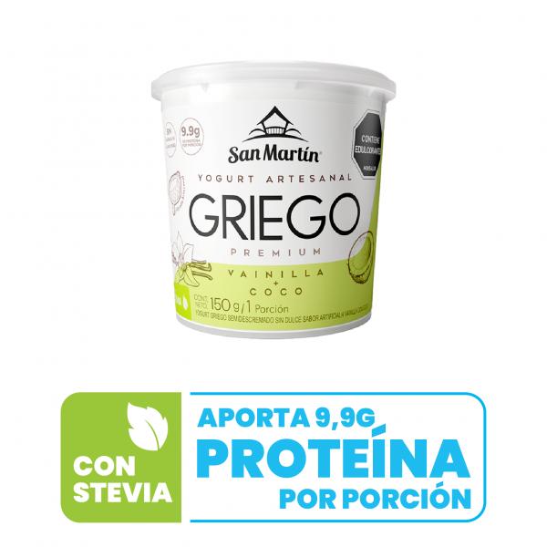 Yogurt Griego San Martín sin harinas ni almidones. Es una excelente fuente de proteína. Endulzado con Stevia y no tiene azúcares añadidos.