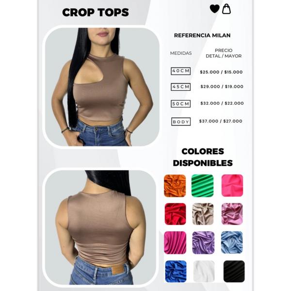 El Crop Top Milan es esa prenda infaltable en tu armario: versátil, cómodo y con un diseño que realza tu silueta de forma natural. Confeccionado en tela suave y de excelente ajuste, es perfecto para combinar con jeans, faldas o pantalones de tiro alto. Su corte moderno y femenino lo convierte en la elección ideal para looks casuales o más atrevidos, según cómo lo combines.