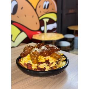 Salchipapa acompañada de papas a la francesa, salchicha ranchera, platano maduro, queso, maiz, Alitas BBQ por 8, salsa de la casa, el mini tiene un costo de 32.000