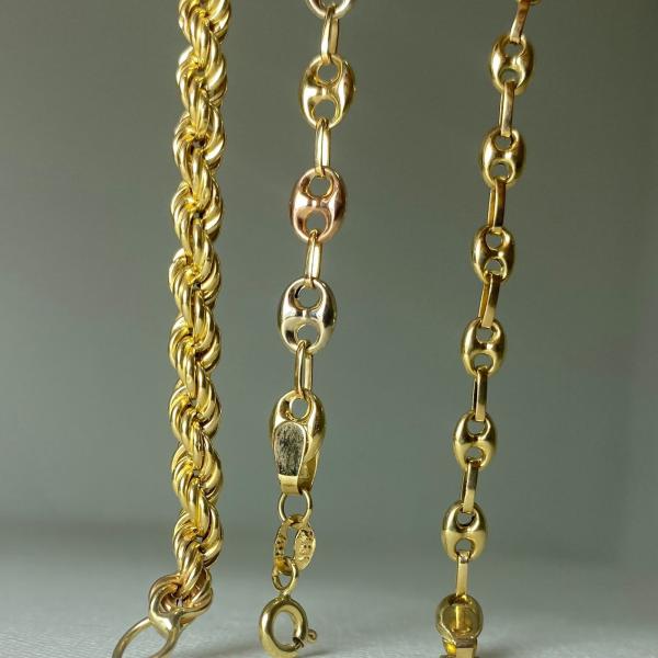 💛 Cadenas de Oro – Estilo, Calidad y Brillo que Enamora 💛 Elige la cadena que mejor se adapte a tu personalidad y luce una joya que habla por ti. Estas piezas están elaboradas en oro de alta calidad, con acabados impecables y estilos variados que van desde el trenzado clásico tipo cuerda, hasta diseños modernos con eslabones ovalados y combinaciones en tonos dorado y rosado.