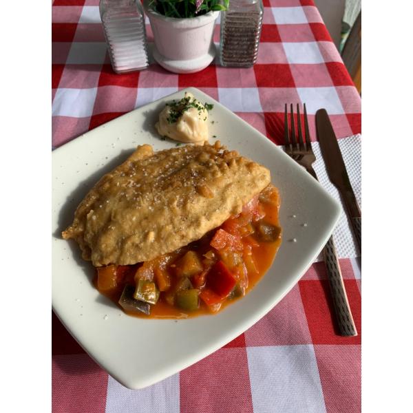 Tilapia rebozada acompañada con pisto, camita de verduras