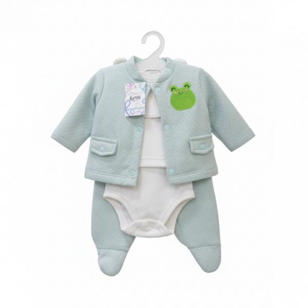 Adorable conjunto en tono aqua con un simpático diseño de rana. Ideal para la comodidad diaria de tu bebé. Incluye chaqueta, body, pantalón con pie y babero. El precio depende de la talla.
