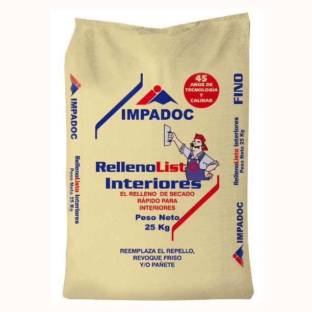 Producto en polvo color grisáceo, puede ser usado como sustituto del repello tradicional, ideal para trabajar sobre muros interiores. Viene en dos referencias: GRUESO para mamposterías en ladrillo y bloques de hormigón y FINO para concreto vaciado y/o prefabricado. El rellenolisto interiores puede ser usado como sustituto del repello tradicional con las ventajas de una aplicación más fácil, rápida y limpia. Debido a su fórmula avanzada, genera alto rendimiento para el aplicador.