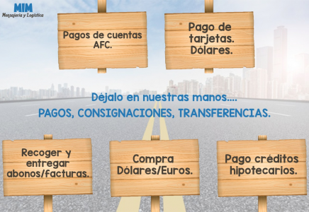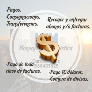 Se realizan todo tipo de pagos en entidades financieras, como: pago de tarjeta de créditos, cambio de divisas, pago cuantas AFC, consignaciones , certificados bancarios , recoger y entregar abonos /facturas, el costo del tramite va desde 7000 hasta 12000 dependiendo de la ubicación.
