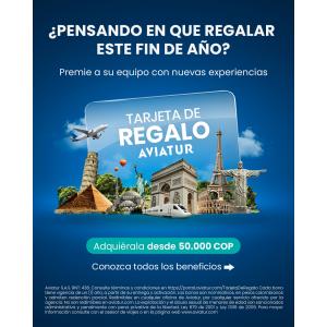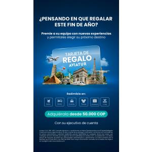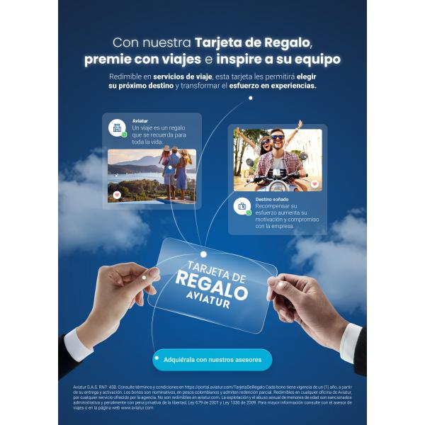 Uso exclusivo en oficinas Aviatur Redimible solo en puntos de venta físicos, no en la web. Vigencia de 1 año El beneficiario tiene hasta 12 meses para disfrutar su tarjeta de regalo. No es canjeable por dinero en efectivo Se debe utilizar en productos y servicios de Aviatur. Redención parcial permitida Se puede utilizar en varias compras hasta agotar el saldo disponible