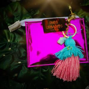 material sintético amarillo verdoso efecto espejo, interior rosa intenso. Incluye llavero con pompón, piedra semipreciosa y Estrella Golfie (el color del llavero puede variar)