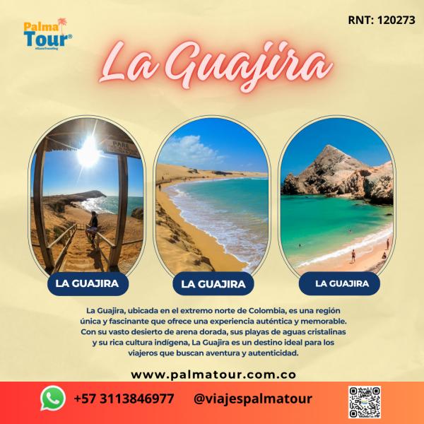 Pack desde $1'490.000. *5 días 4 noches. *Vuelos Ida y Regreso ✈️🎒 *Hotel alimentos según elección 🏨 *Tour cabo de la Vela , Punta Gallinas 🗾 si aplica *Seguro de viaje 🧑⚕️ *Traslados 🚗 * Acomodación Doble, triple, Cuadruple *Precio por Persona Salidas de: Cali, Pereira, Armenia, Medellín, Bogotá. El precio puede variar según la fecha de viaje, o cantidad de personas, la ciudad de salida o el tipo de alimentación.