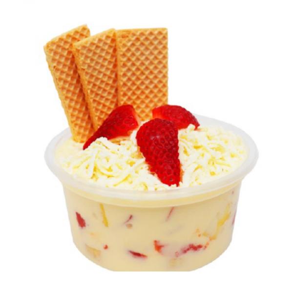 ensalada de frutas de 12 oz, contiene banano, mango, papaya, fresa, manzana roja,. queso y crema de la casa. ¡Cómetela sin regordimiento!