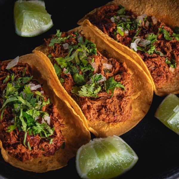 3 piezas de tacos de res desmechada en salsa, en tortilla de maíz, con cebolla y cilantro