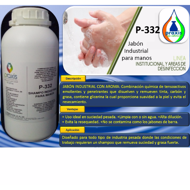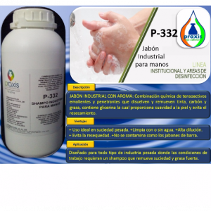 JABÓN INDUSTRIAL CON AROMA: Combinación química de tensoactivos emolientes y penetrantes que disuelven y remueven tinta, carbón y grasa, contiene glicerina la cual proporciona suavidad a la piel y evita el resecamiento.