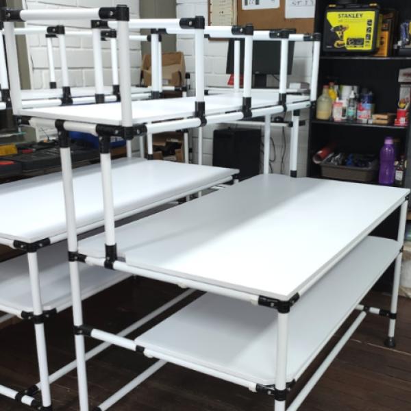 Ideal para procesos de empaque ubicando cartón en la repisa. Con entrepaño inferior para ubicar materiales. superficies en madera aglomerada de 15mm y tapones de caucho en las bases. Ancho 120cm / profundidad 75cm / altura 150cm. Capacidad: 80Kg en mesa y 40Kg en repisa.