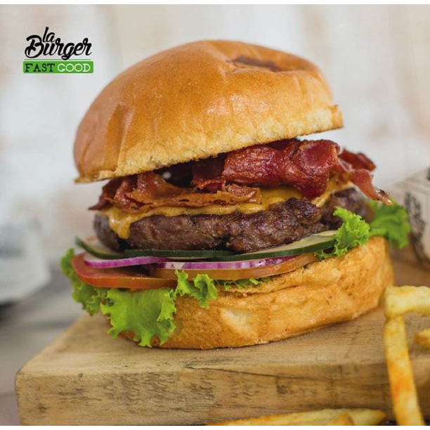 Carne seleccionada, queso cheddar, tocineta crujiente, lechuga orgánica, tomate, cebolla roja, pepinillos y salsa Burger. Pan o lechuga.