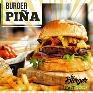 Carne seleccionada, piña a la parrilla, queso cheddar, tocineta crujiente, lechuga orgánica, tomate, cebolla roja y salsa Burger. Pan o lechuga.