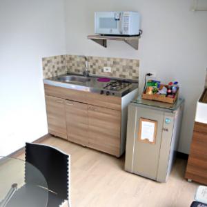 Apartaestudio Familiar Acomodación dos personas en Cama doble, y dos niños pequeños, en Sofacama que se despliega en dos camas sencillas, baño y cocina privados. Cocina dotada con Nevera pequeña, estufa a gas dos hornillas, horno microondas y utensilios básicos para preparar y cocinar alimentos. Comedor, en la misma zona de la cocina. Zona de lavado con pequeño lavadero dentro de la cocina . Smart TV, Armario amplio, Wifi, agua caliente.