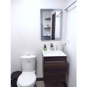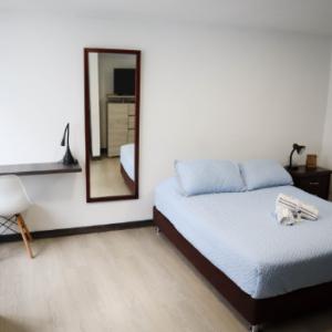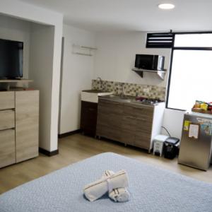 Acomodación dos personas en Cama doble, baño y cocina privados en un solo ambiente (Ver fotos) . Cocina dotada con Nevera pequeña, estufa a gas dos hornillas, horno microondas y utensilios básicos para preparar y cocinar alimentos. Escritorio y silla dentro de la habitación. Smart TV, Armario, Wifi, agua caliente. Ventana para patio interior.