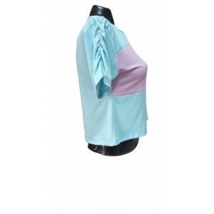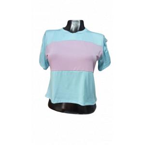 Presentamos una moderna camiseta de corte casual con un diseño bicolor que combina tonos pasteles. La parte superior es de color azul cielo, mientras que la sección central es de un delicado color lila, ambas separadas por una línea horizontal. Esta camiseta cuenta con mangas cortas y un cuello redondo clásico, ofreciendo un ajuste relajado y cómodo. Confeccionada en tejido suave al tacto, esta pieza es ideal para crear atuendos desenfadados pero con estilo. ¡Añade un toque de frescura y moderni