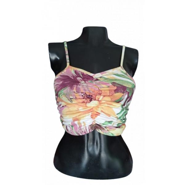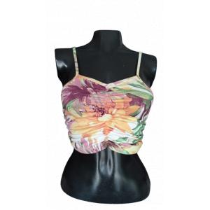 Este top estampado con diseño floral multicolor es perfecto para un look veraniego y casual. Con tirantes finos ajustables y detalle fruncido en el frente, ofrece comodidad y estilo. Ideal para combinar con jeans, faldas o pantalones cortos. ¡Añade un toque vibrante a tu guardarropa!