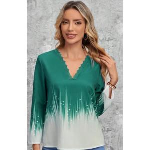 Blusa de manga larga con escote en V y detalle de encaje festoneado. Diseño degradado que va de un tono oscuro a uno claro, simulando rayos de luz. Ideal para un look casual o semi-formal, combinable con jeans o faldas.