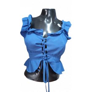 Top corto con mangas abullonadas y elástico en los hombros para un ajuste cómodo. Cuenta con detalle fruncido en el frente y un lazo decorativo, ideal para un look veraniego y fresco. Perfecto para combinar con faldas o pantalones cortos.