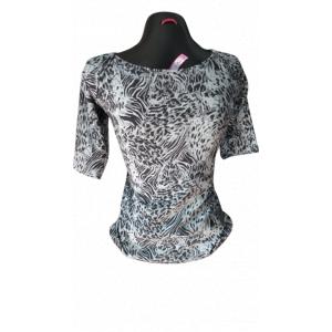 Blusa con estampado de motivos selváticos en gris y negro. Diseño con mangas cortas abullonadas, escote en ‘V’ con lazo decorativo y detalle de botón. Corte ajustado que realza la silueta. Ideal para un look casual o elegante.