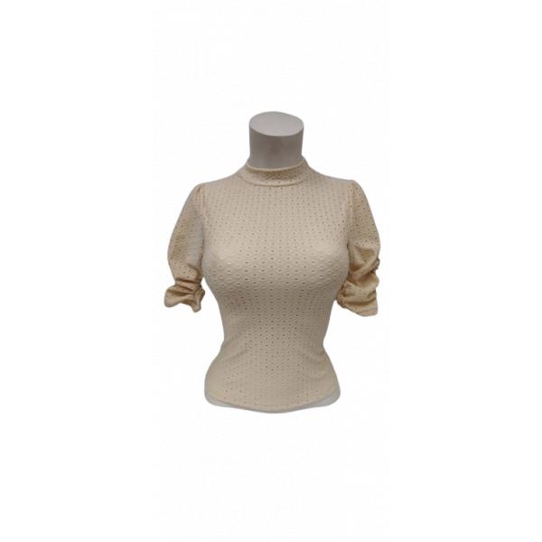 Blusa de manga larga con cuello alto y elegante patrón perforado. Su diseño ajustado realza la silueta, mientras que el tejido suave y transpirable asegura comodidad. Perfecta para un look sofisticado y versátil, ideal para cualquier ocasión.