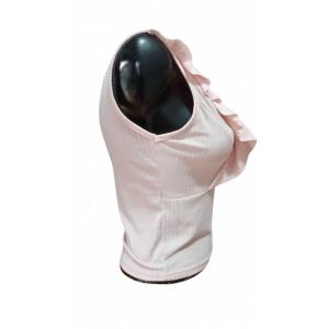 Descubre la elegancia casual con esta blusa de tono rosa pálido. Su diseño único con volantes en los hombros añade un toque femenino y sofisticado, perfecto para destacar en cualquier ocasión. Confeccionada en tejido de canalé que realza la figura, es la combinación ideal de confort y estilo.