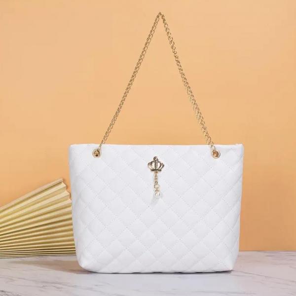 ¡Descubre la elegancia atemporal con este bolso de hombro blanco acolchado! Su diseño clásico con costuras detalladas y cadena dorada ofrece un toque de sofisticación a cualquier atuendo. Adornado con un delicado colgante, es el accesorio perfecto para realzar tu estilo diario o complementar una noche especial. 🌟