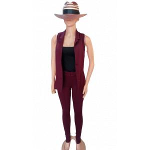 Luce sofisticado con este conjunto de top negro, chaleco y pantalones burdeos. Completa el look con un sombrero a rayas para un toque único. Perfecto para cualquier ocasión, desde eventos formales hasta salidas casuales. ¡Destaca con estilo y elegancia!