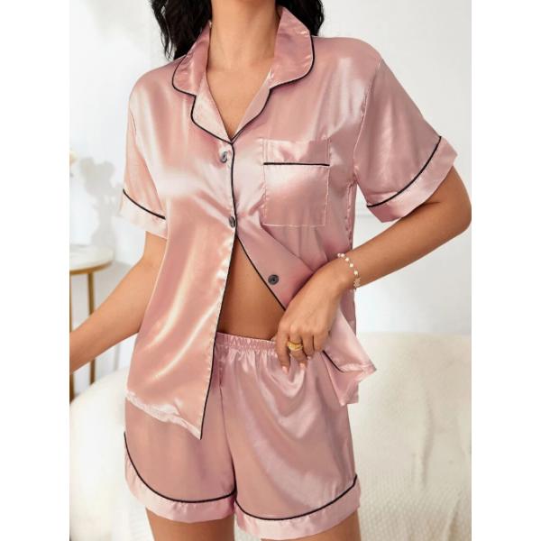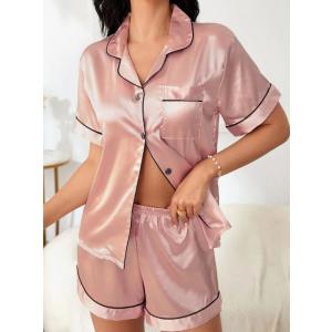 Disfruta de una noche de lujo con este conjunto de pijama de satén rosa. Con shorts y camisa de manga corta con detalles en blanco, es perfecto para relajarte con estilo. ¡Duerme cómoda y luce fabulosa!