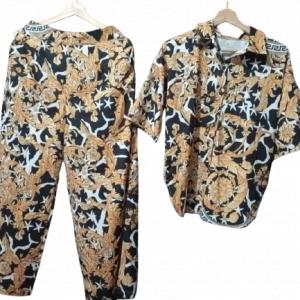 Este conjunto de pantalón y camisa presenta un vibrante patrón de animales como tigres y aves, rodeados de follaje y flores. Los tonos marrones, negros y blancos crean un look sofisticado y atrevido, perfecto para destacar en cualquier ocasión. ¡Atrévete a lucir salvaje y elegante con este conjunto único!
