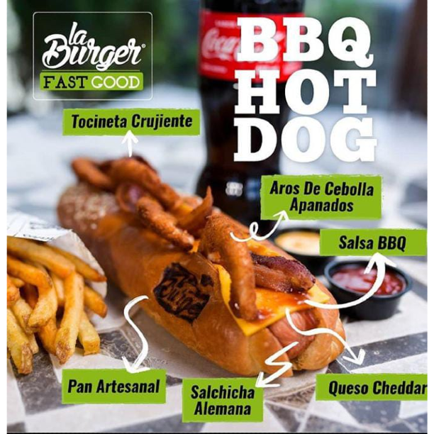 Pan artesanal, salchicha alemana, queso cheddar, tocineta crujiente, salsa bbq y aros de cebolla apanados.