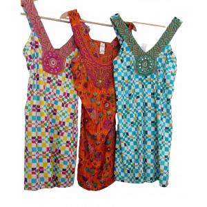 ¡Luce espectacular con estos vestidos vibrantes! El vestido a cuadros multicolor con detalles rosados, el vestido naranja con patrones de flores y pavos reales, y el vestido a cuadros azul y blanco con acentos verdes son perfectos para cualquier ocasión. Con sus diseños únicos y colores llamativos, estos vestidos te harán destacar. ¡Añade un toque de alegría y estilo a tu guardarropa con estas piezas únicas!