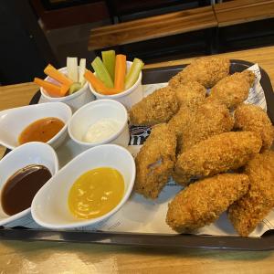 6 alitas apanadas con una porción de papas o verdura y una salsa de elección