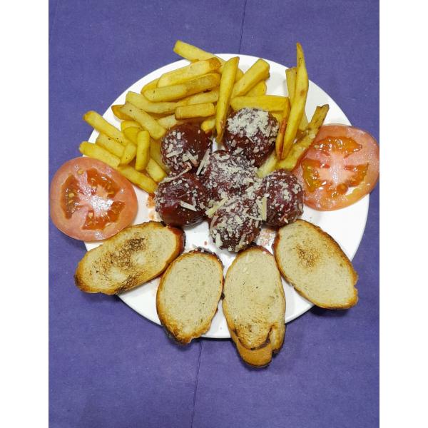 El bombom meat viene con seis albóndigas, pan tostado, papas a la francesa, tomate y queso parmesano