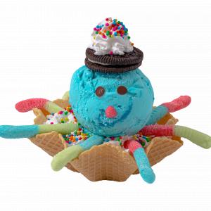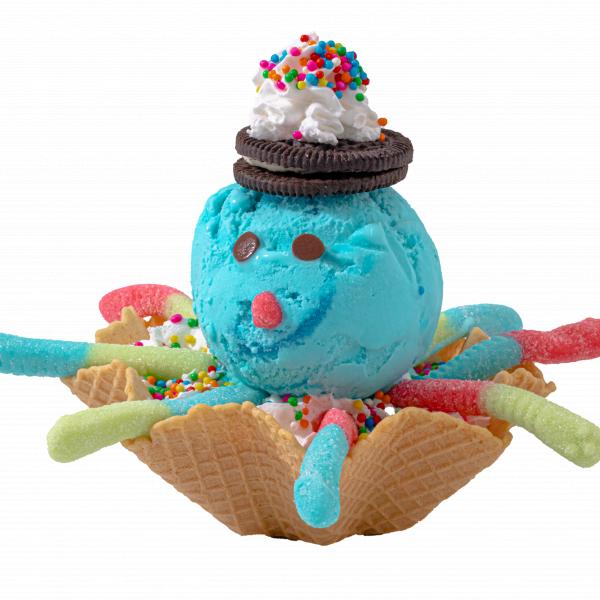 Helado en forma de pulpo con canasta, una bola de helado, gomitas, dulces, chantilli, galleta.