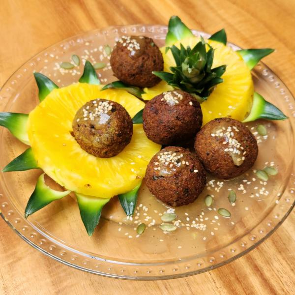 Crujientes bolitas de garbanzo sazonadas con especias del Medio Oriente, bañadas en una exótica y dulce salsa de piña que realza su sabor. Una fusión vibrante entre lo tradicional y lo tropical.