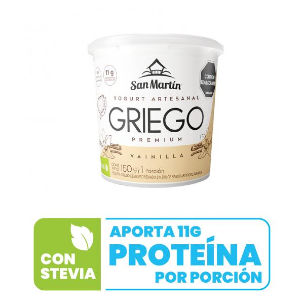 Yogurt griego San Martín sin harinas ni almidones. Es una excelente fuente de proteína. Endulzado con Stevia y no tiene azúcares añadidos.