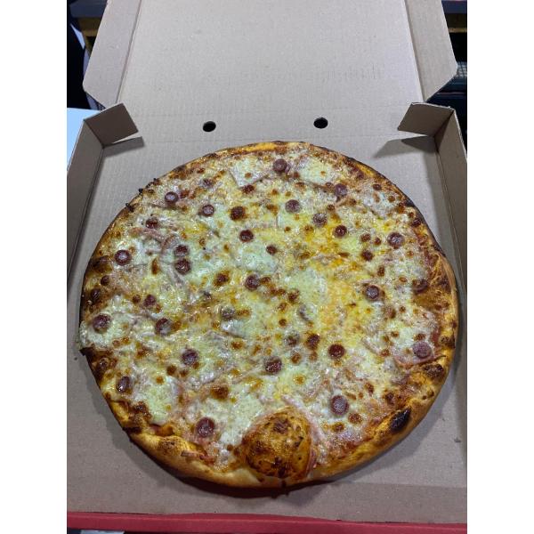 Pizza De carnes con salami, jamon ahumado, cabano, queso mozzarella, salsa napolitana y nuestra masa especial de la casa. Personal $16.000, Mediana $40.000, Familiar $60.000
