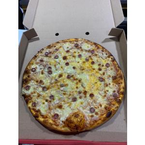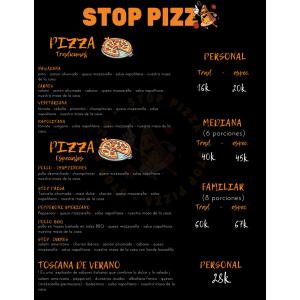 Pizza stop carnes con salami amaericano, chorizo iberico, jamon ahumado, cabano, queso mozzarella, salsa napolitana y nuestra masa especial de la casa con borde de bocadillo. Personal $20.000, Mediana $45.000, Familiar $68.000