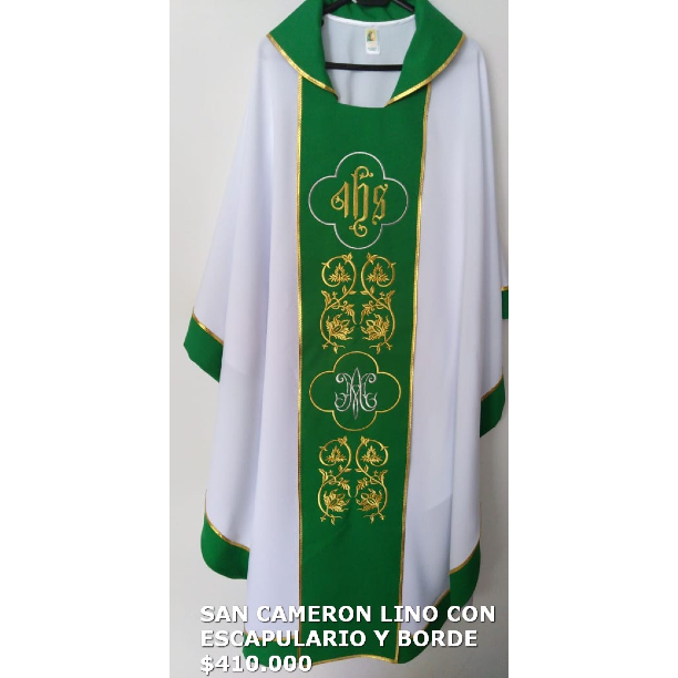 LA CASULLA SAN CAMERON ESTA CONFECCIONADA EN LINO, CON ESCAPULARIO BORDADO A MAQUINA.
