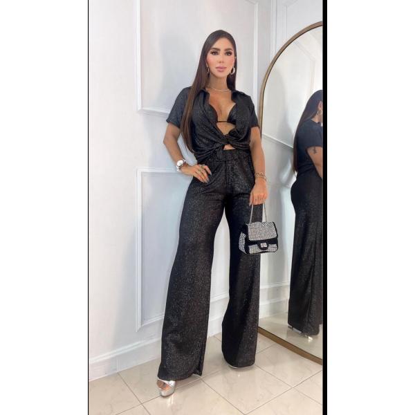 Este conjunto habla por sí solo: elegante, atrevido y con ese toque de brillo que roba miradas. Es un trío en talla única que se adapta perfecto a cuerpos S, M y L gracias a su tela con excelente caída y elasticidad. El pantalón palazzo estiliza, el top resalta lo justo y la camisa amarrada le da el toque chic. Ideal para noches especiales o cuando quieres destacar sin esfuerzo. ¿Te animas? Escríbenos y lo separamos para ti.
