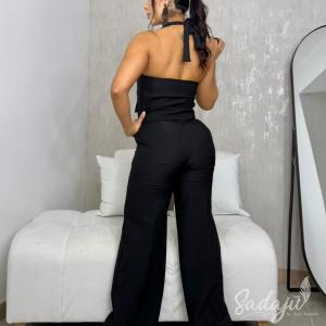 hermoso set Confeccionado en tela licrada de excelente calidad, se adapta a la perfección a tallas 10 y 12, realzando tus curvas como debe ser, sin apretar y con toda la comodidad del mundo. El top estilo halter con escote pronunciado y detalle frontal le da ese aire sexy pero sofisticado, mientras el pantalón bota ancha equilibra el look y estiliza al instante.