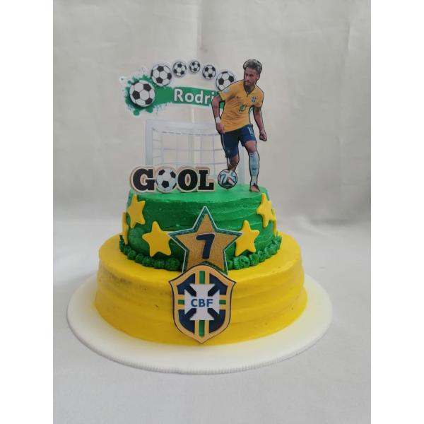 ¡Una torta para verdaderos fanáticos del fútbol! Inspirada en la Selección de Brasil, esta torta puede incluir el jugador que más te guste, número, escudo, estrellas y más. Personalízala a tu estilo ¡perfecta para celebrar tus fechas especiales!